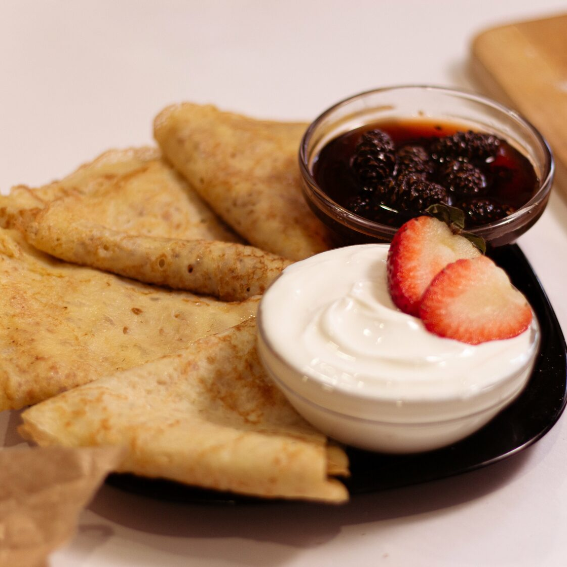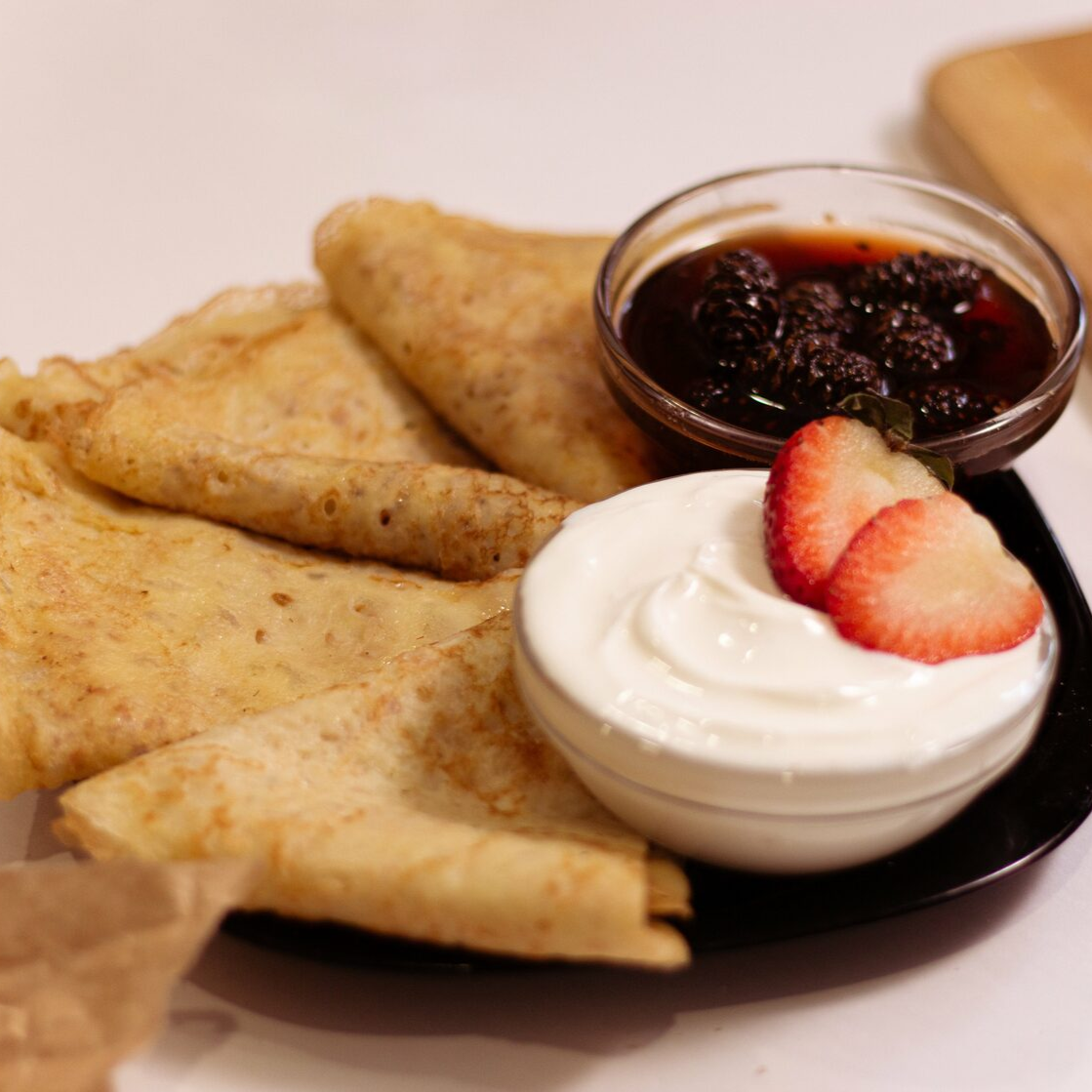 Подача. Подавать тонкие блинчики по этому рецепту лучше всего со сметаной или вареньем.