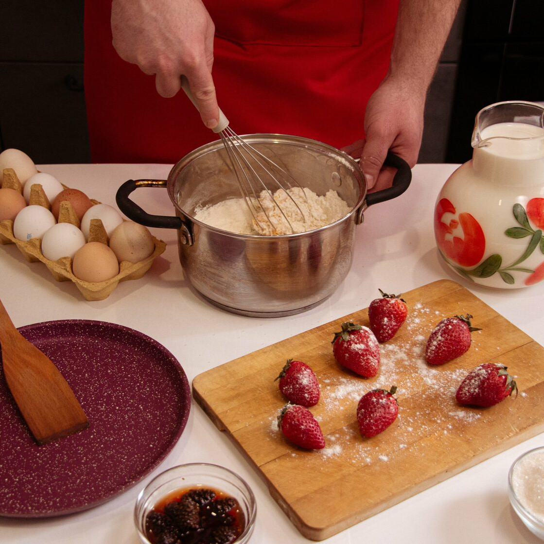 Совет шефа: сковорода должна быть достаточно разогретой, чтобы блинчики хорошо выпекались и не рвались.
